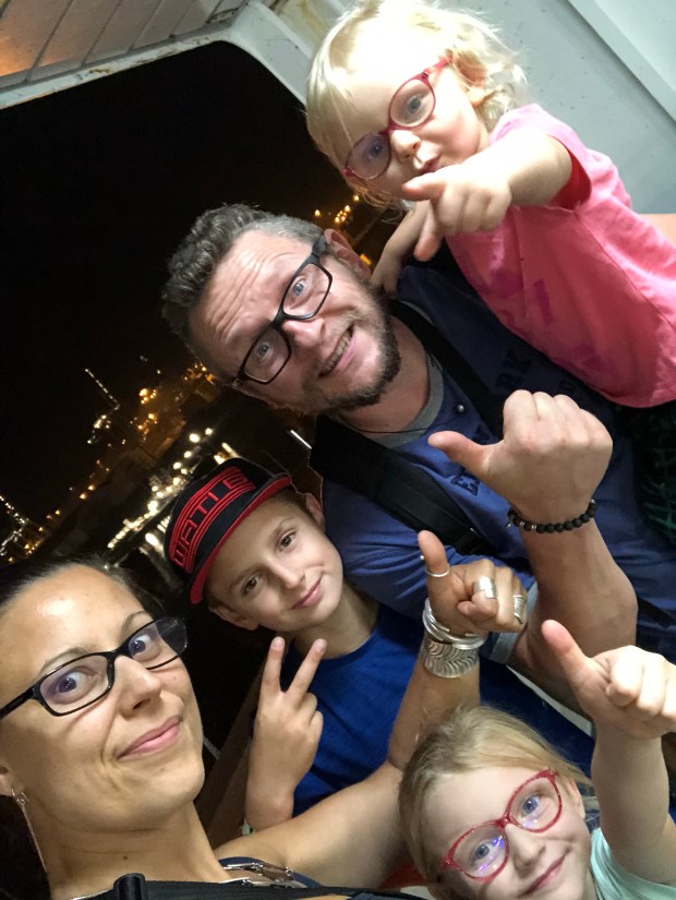 Nous nous installons sur le pont du bateau pour dire au revoir à la France 🇫🇷. Le bateau lève l’ancre, les enfants sont proche de nous. Nous formons un cocon, une famille, une tribu unie. On se regarde avec Geo… ça y est c’est parti… et on ressent que nous sommes exactement là où nous devons être. Nous ressentons cette sérénité qui nous envahit. Nous sommes face à l’inconnu et pourtant, il n’y a pas de peur, pas de stress… moi qui programme, planifie, organise tout d’habitude afin d’être dans le contrôle… là j’ai juste envie de me laisser porter par cette merveilleuse aventure qui nous attend. Être dans le présent, être ensemble, être en pleine conscience avec moi-même.