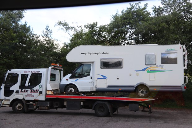 Après nous avoir communiqué leur position GPS, nous sommes déjà sur la route qui nous mène à eux, nous arrivons en même temps que la dépanneuse et décidons de les suivre jusqu’au garage près de « Killin ».