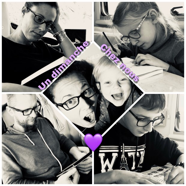 J’apprécie vraiment ce jour dans la semaine, les enfants choisissent toujours des activités calmes… Emy en profite pour faire une grosse sieste, Lily dessine, peint, crée… bien souvent, Enzo passe du dessin, à l’écriture de sa BD, à la lecture… Quant à Geoffrey et moi même, nous écrivons, lisons… réfléchissons face à l’horizon que nous offre notre fenêtre ouverte sur le monde. C’est un réel moment de calme, de sérénité, de repos pour toute la petite famille.