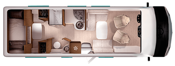 Camping-car Itineo SB740, en version jour, avec la chambre enfants, l’espace salle de bain ouverte avec les wc, lavabo et la douche, la cuisine et le salon